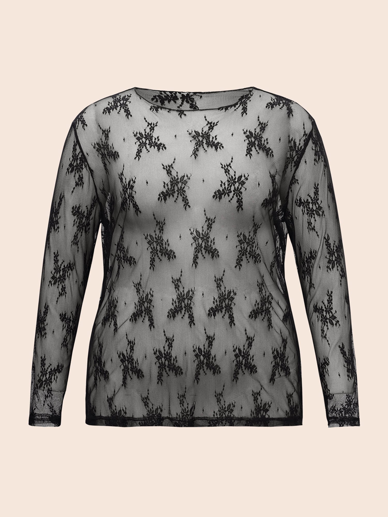 Elevate your look with a bold feminine touch in our soft lace slim-fit top, versatile enough to pair with high-waisted pants or skirts. The sheer fabric beautifully flatters your neckline, adorned with an intricate pattern.
